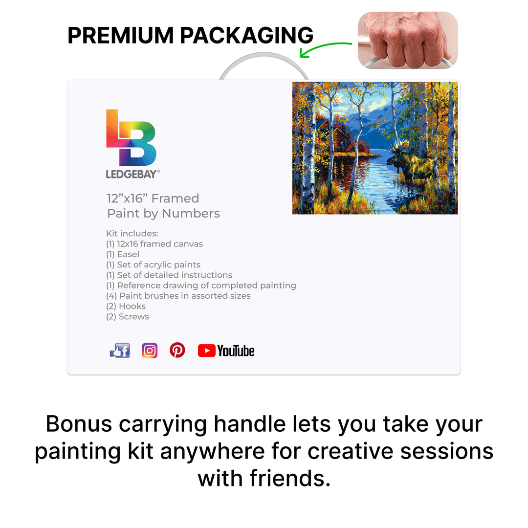 Our Framed kits include:    Ledgebay provides everything you need to become an inspired artist. Our large paint by numbers kit for adults includes one pre-stretched and framed premium pre-primed canvas, set of instructions, 4 paint brushes of different sizes, a tabletop easel, 1 vacuum sealed set of acrylic paints, a small photo of the finished painting for reference, and an 11" x 17" printout in case the artist messes up.