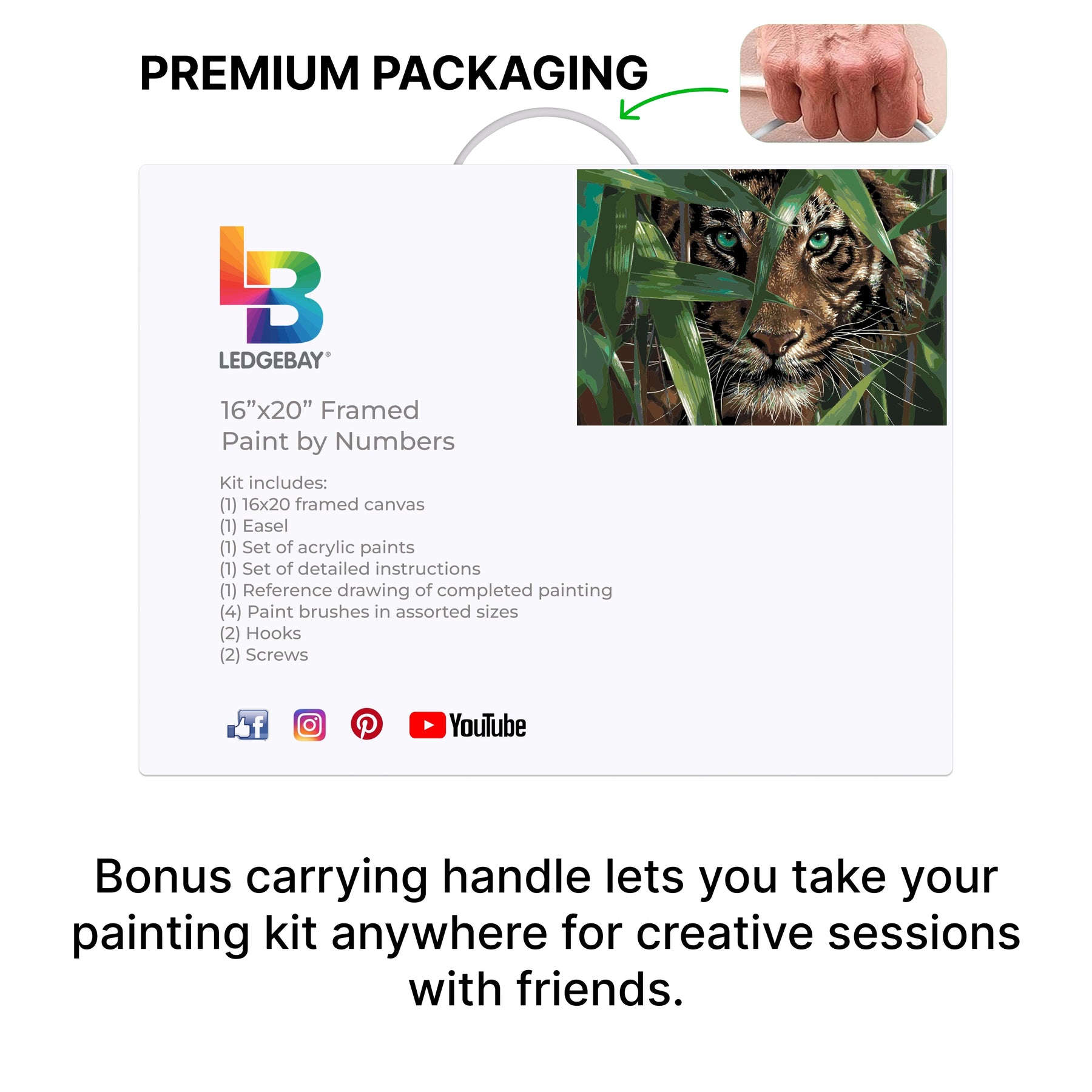 Our Framed kits include:    Ledgebay provides everything you need to become an inspired artist. Our large paint by numbers kit for adults includes one pre-stretched and framed premium pre-primed canvas, set of instructions, 4 paint brushes of different sizes, a tabletop easel, 1 vacuum sealed set of acrylic paints, a small photo of the finished painting for reference, and an 11" x 17" printout in case the artist messes up.