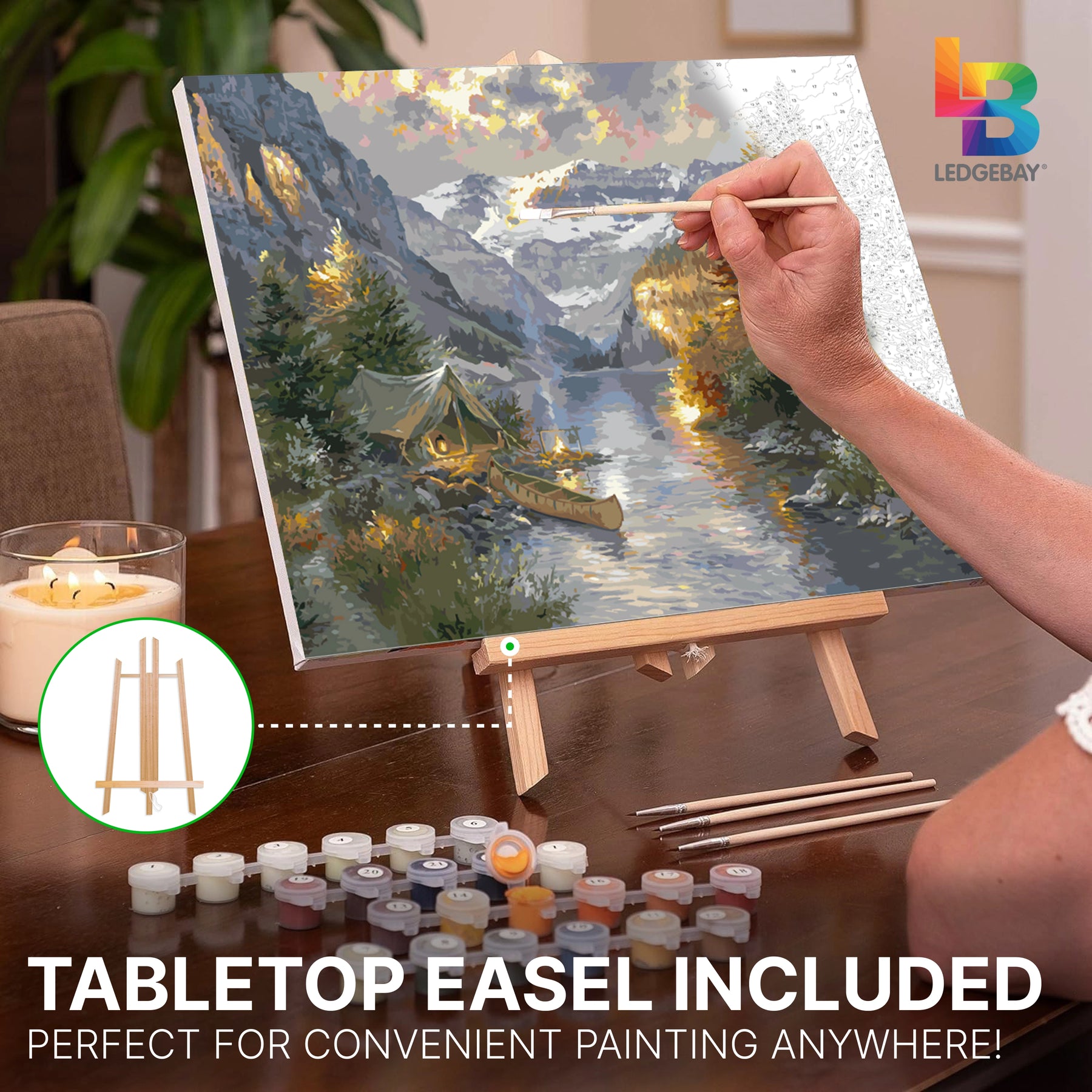 Our Framed kits include:    Ledgebay provides everything you need to become an inspired artist. Our large paint by numbers kit for adults includes one pre-stretched and framed premium pre-primed canvas, set of instructions, 4 paint brushes of different sizes, a tabletop easel, 1 vacuum sealed set of acrylic paints, a small photo of the finished painting for reference, and an 11" x 17" printout in case the artist messes up.