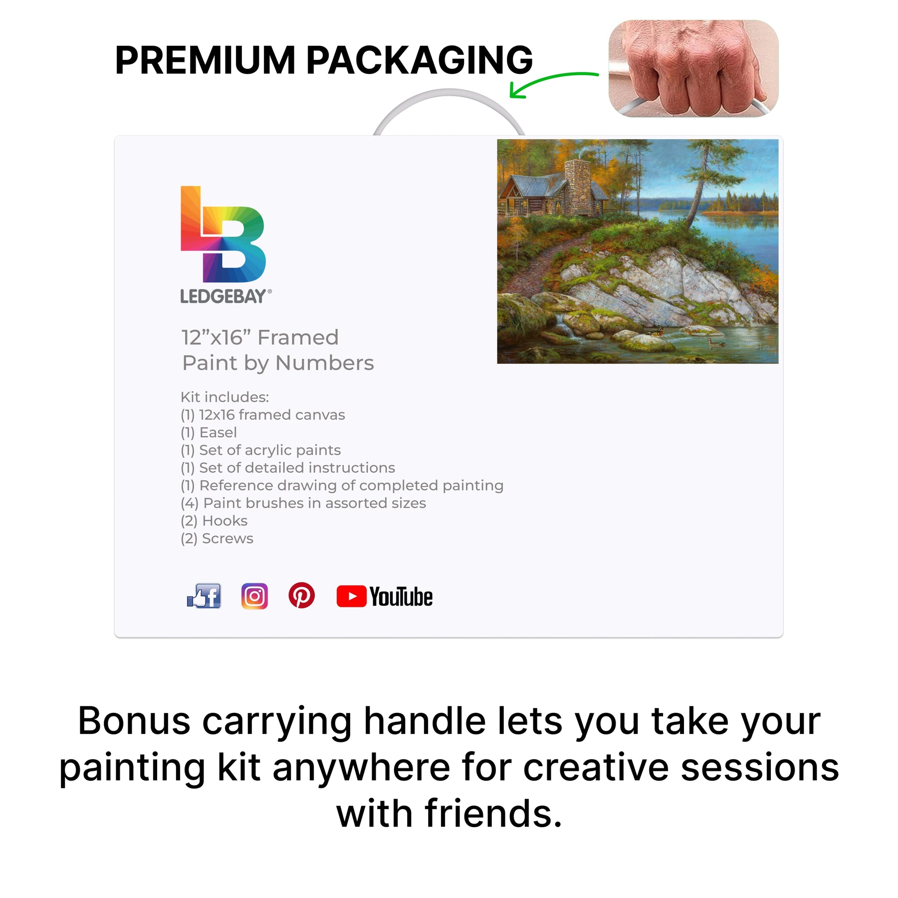 Our Framed kits include:    Ledgebay provides everything you need to become an inspired artist. Our large paint by numbers kit for adults includes one pre-stretched and framed premium pre-primed canvas, set of instructions, 4 paint brushes of different sizes, a tabletop easel, 1 vacuum sealed set of acrylic paints, a small photo of the finished painting for reference, and an 11" x 17" printout in case the artist messes up.
