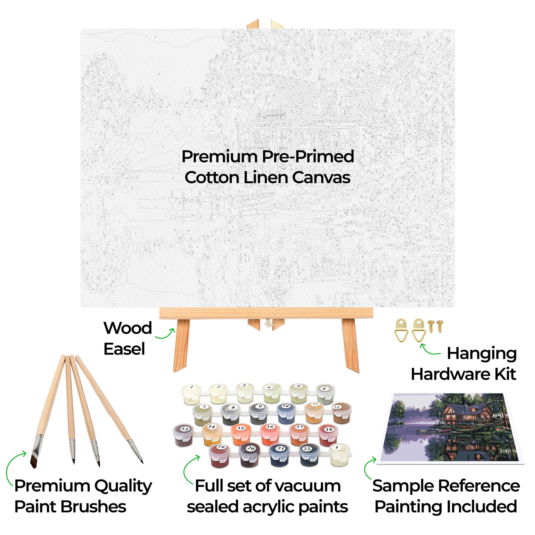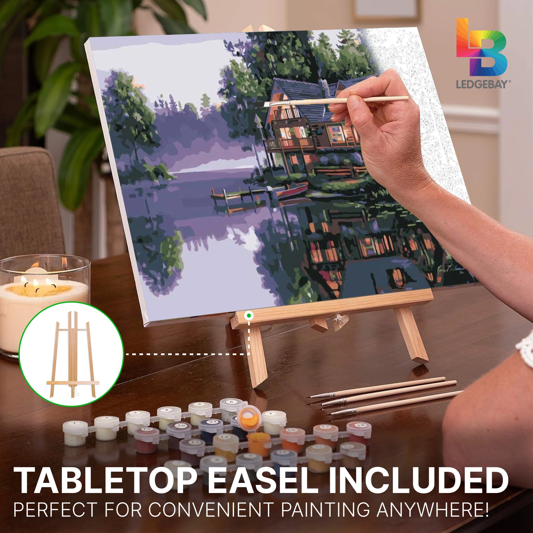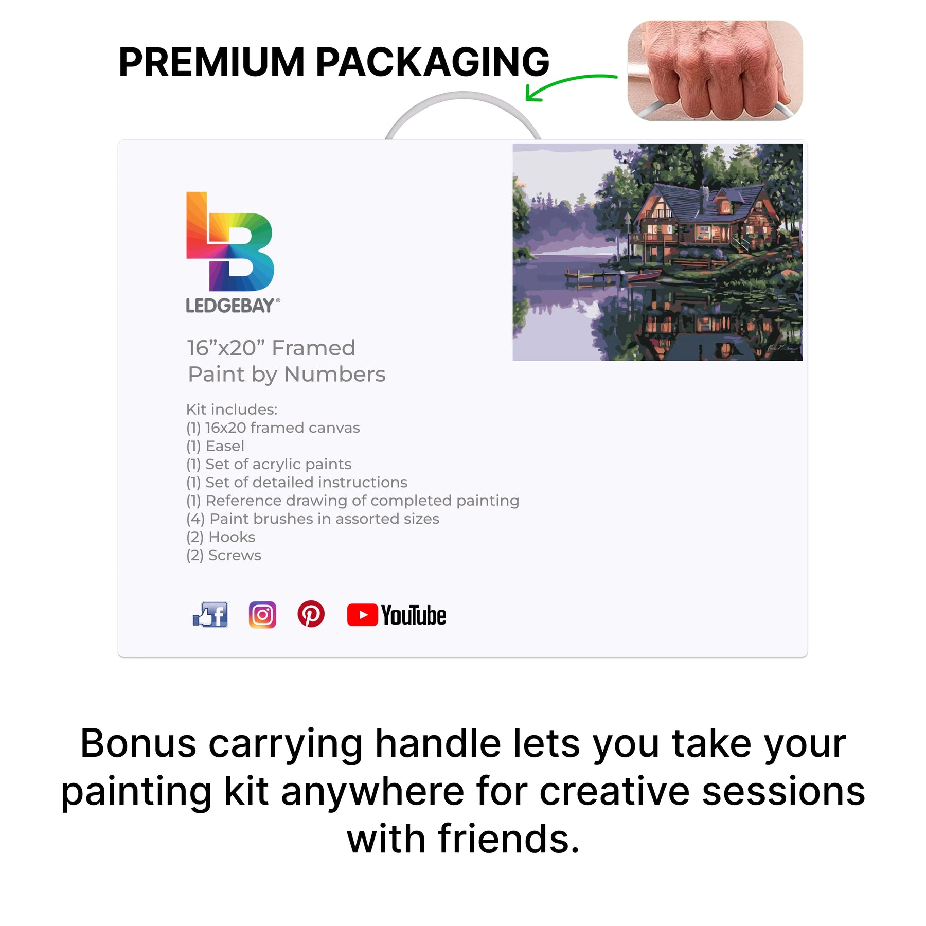 Our Framed kits include:    Ledgebay provides everything you need to become an inspired artist. Our large paint by numbers kit for adults includes one pre-stretched and framed premium pre-primed canvas, set of instructions, 4 paint brushes of different sizes, a tabletop easel, 1 vacuum sealed set of acrylic paints, a small photo of the finished painting for reference, and an 11" x 17" printout in case the artist messes up.