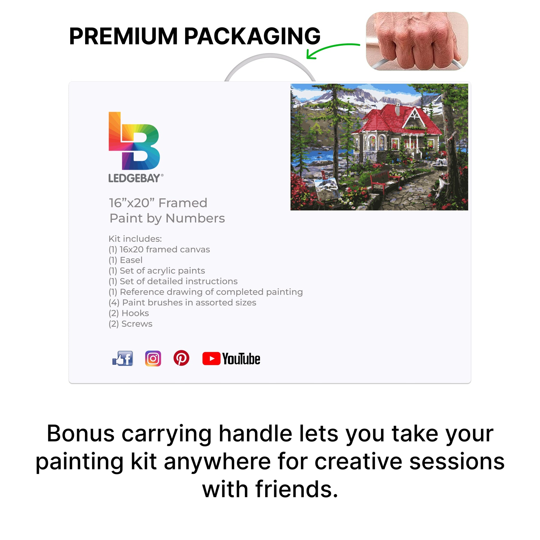 Our Framed kits include:    Ledgebay provides everything you need to become an inspired artist. Our large paint by numbers kit for adults includes one pre-stretched and framed premium pre-primed canvas, set of instructions, 4 paint brushes of different sizes, a tabletop easel, 1 vacuum sealed set of acrylic paints, a small photo of the finished painting for reference, and an 11" x 17" printout in case the artist messes up.