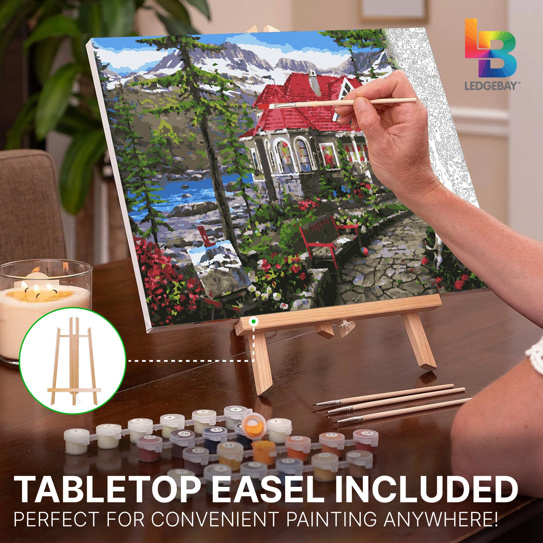 Our Framed kits include:    Ledgebay provides everything you need to become an inspired artist. Our large paint by numbers kit for adults includes one pre-stretched and framed premium pre-primed canvas, set of instructions, 4 paint brushes of different sizes, a tabletop easel, 1 vacuum sealed set of acrylic paints, a small photo of the finished painting for reference, and an 11" x 17" printout in case the artist messes up.