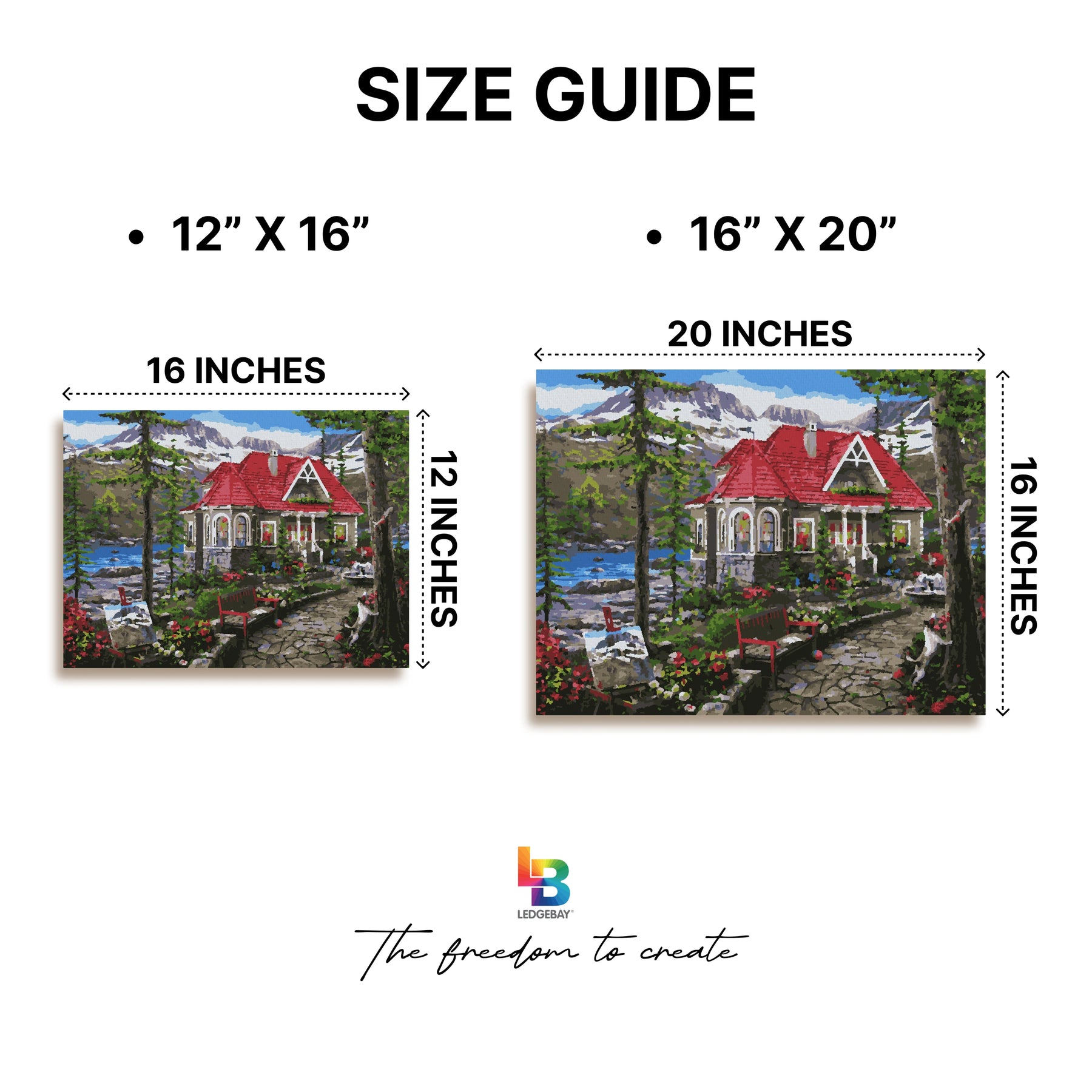 Our Unframed kits include:   Ledgebay provides everything you need to become an inspired artist. Our large paint by numbers kit for adults includes one premium pre-primed canvas, set of instructions, 4 paint brushes of different sizes, 1 vacuum sealed set of acrylic paints, a small photo of the finished painting for reference, and an 11" x 17" printout in case the artist messes up.