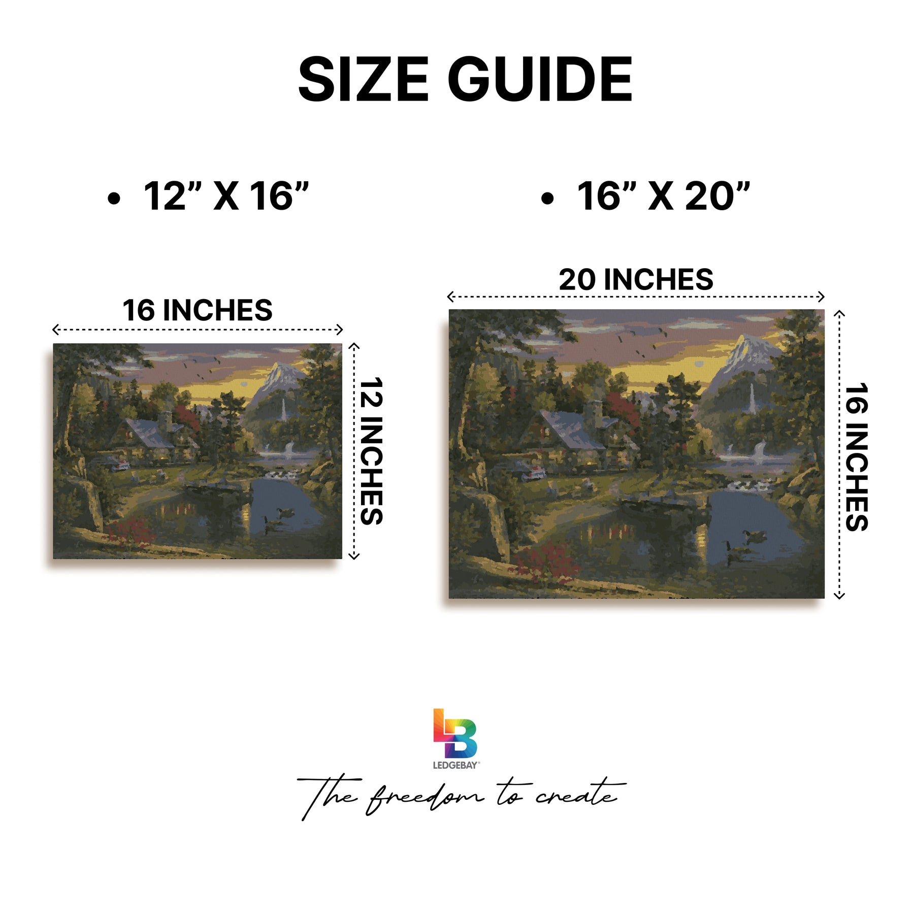 Our Unframed kits include:   Ledgebay provides everything you need to become an inspired artist. Our large paint by numbers kit for adults includes one premium pre-primed canvas, set of instructions, 4 paint brushes of different sizes, 1 vacuum sealed set of acrylic paints, a small photo of the finished painting for reference, and an 11" x 17" printout in case the artist messes up.