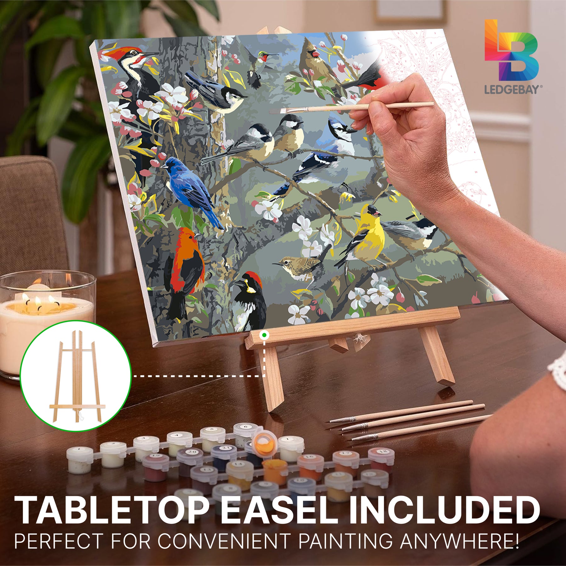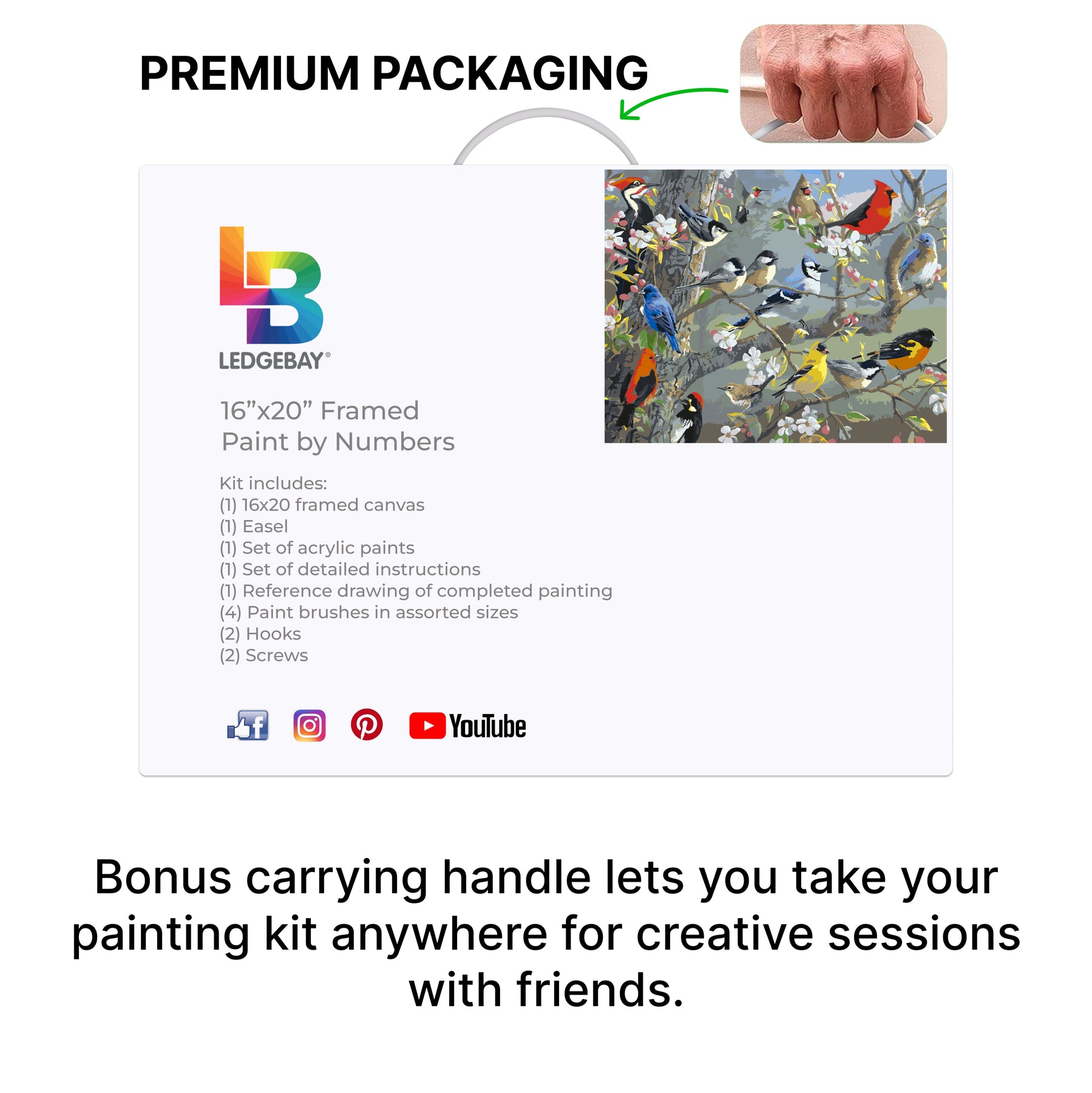 Our Framed kits include:    Ledgebay provides everything you need to become an inspired artist. Our large paint by numbers kit for adults includes one pre-stretched and framed premium pre-primed canvas, set of instructions, 4 paint brushes of different sizes, a tabletop easel, 1 vacuum sealed set of acrylic paints, a small photo of the finished painting for reference, and an 11" x 17" printout in case the artist messes up.