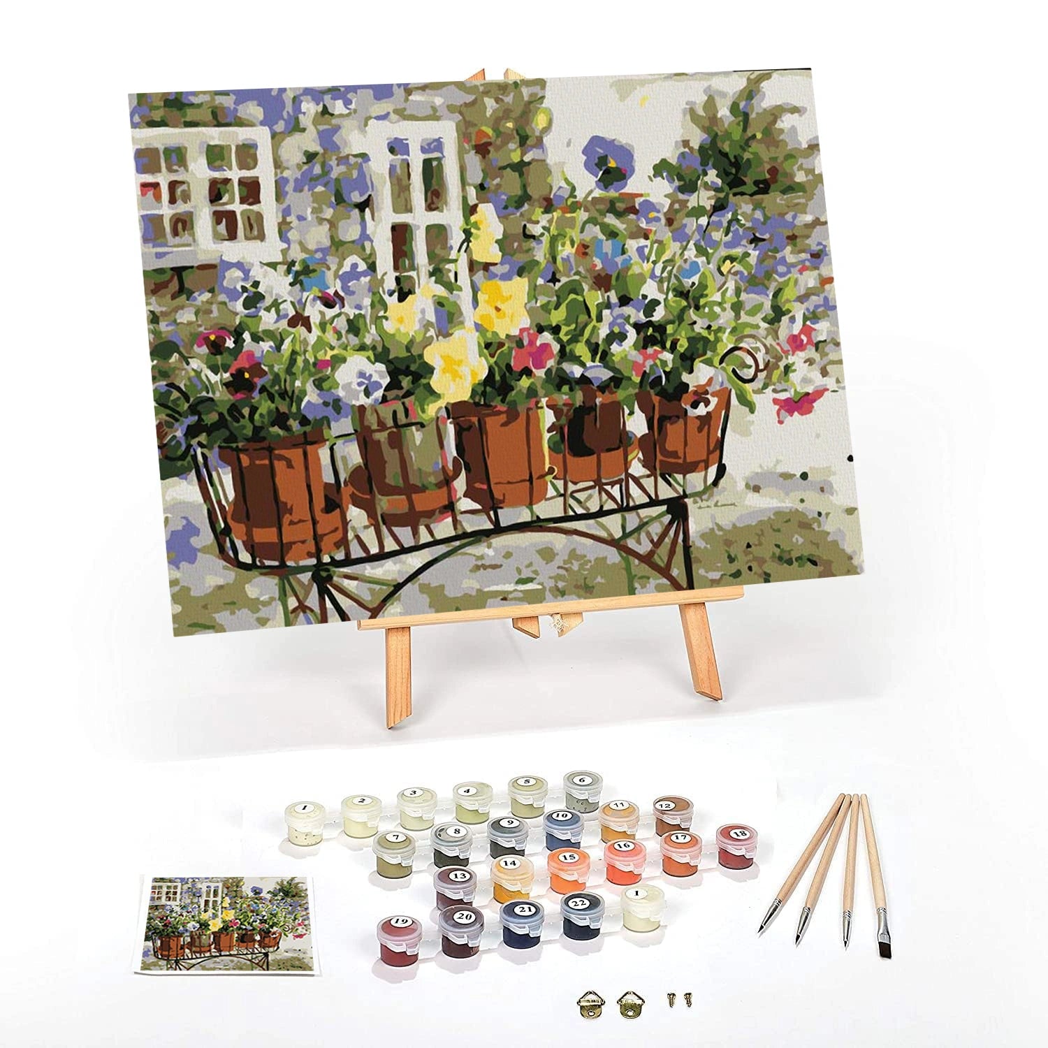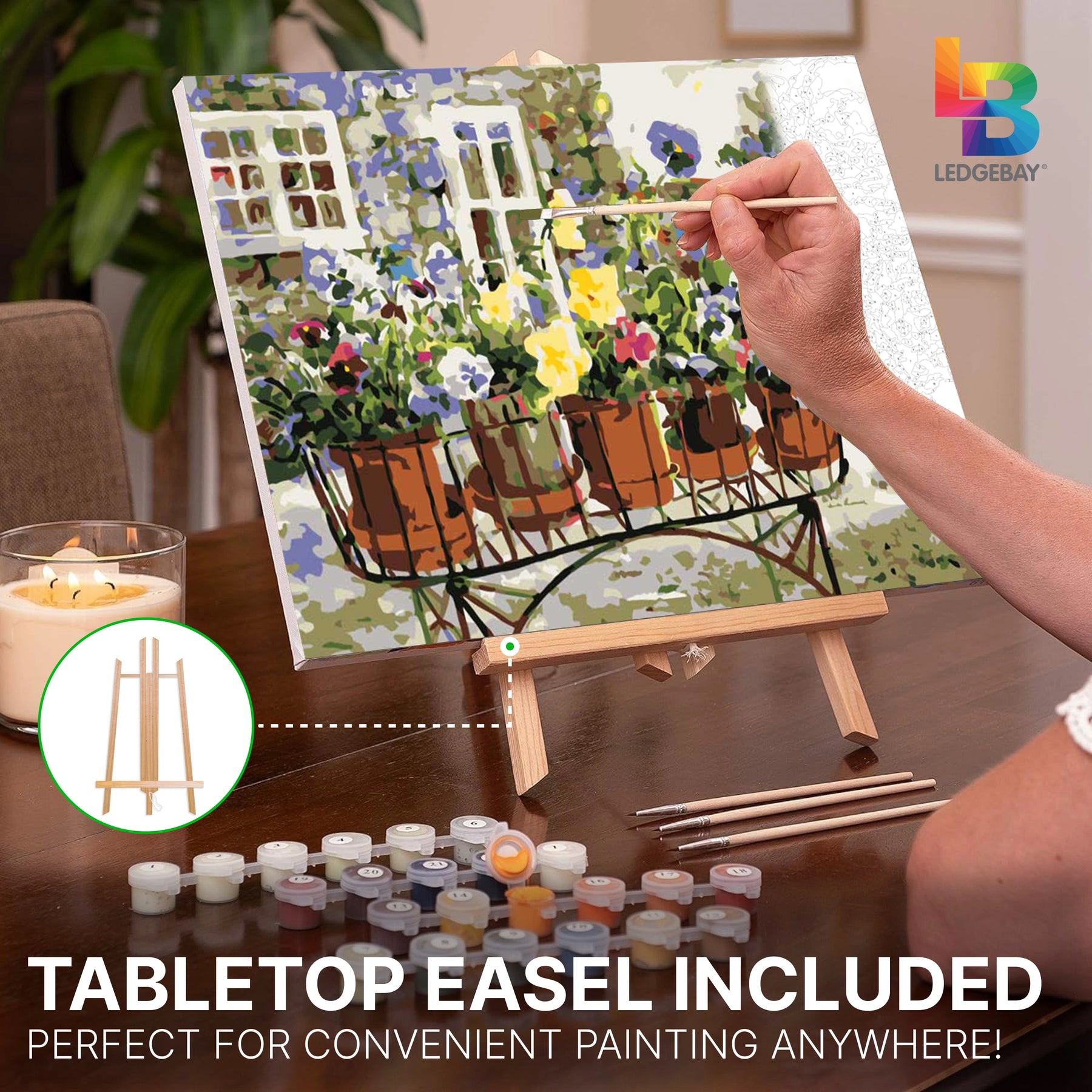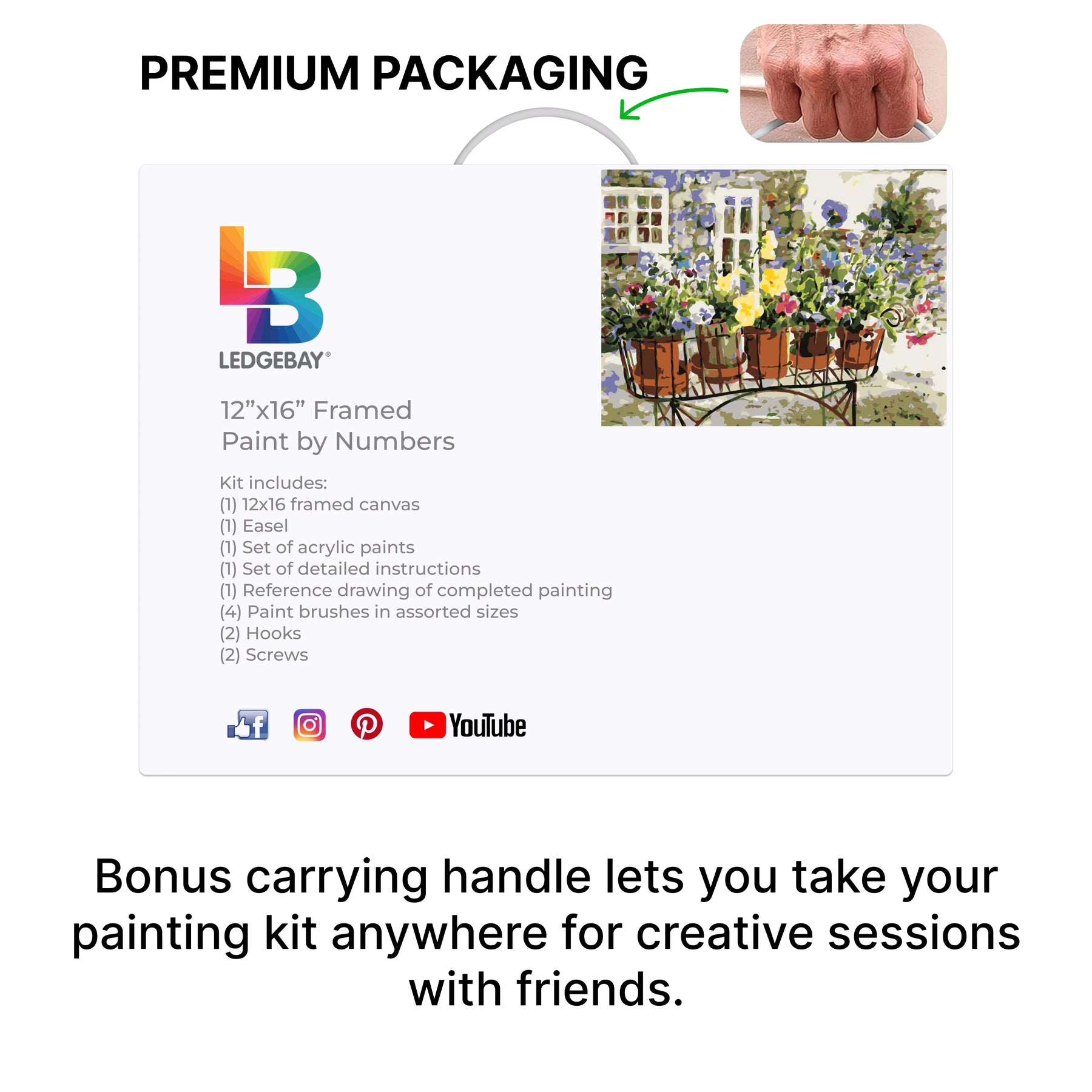 Our Framed kits include:    Ledgebay provides everything you need to become an inspired artist. Our large paint by numbers kit for adults includes one pre-stretched and framed premium pre-primed canvas, set of instructions, 4 paint brushes of different sizes, a tabletop easel, 1 vacuum sealed set of acrylic paints, a small photo of the finished painting for reference, and an 11" x 17" printout in case the artist messes up.