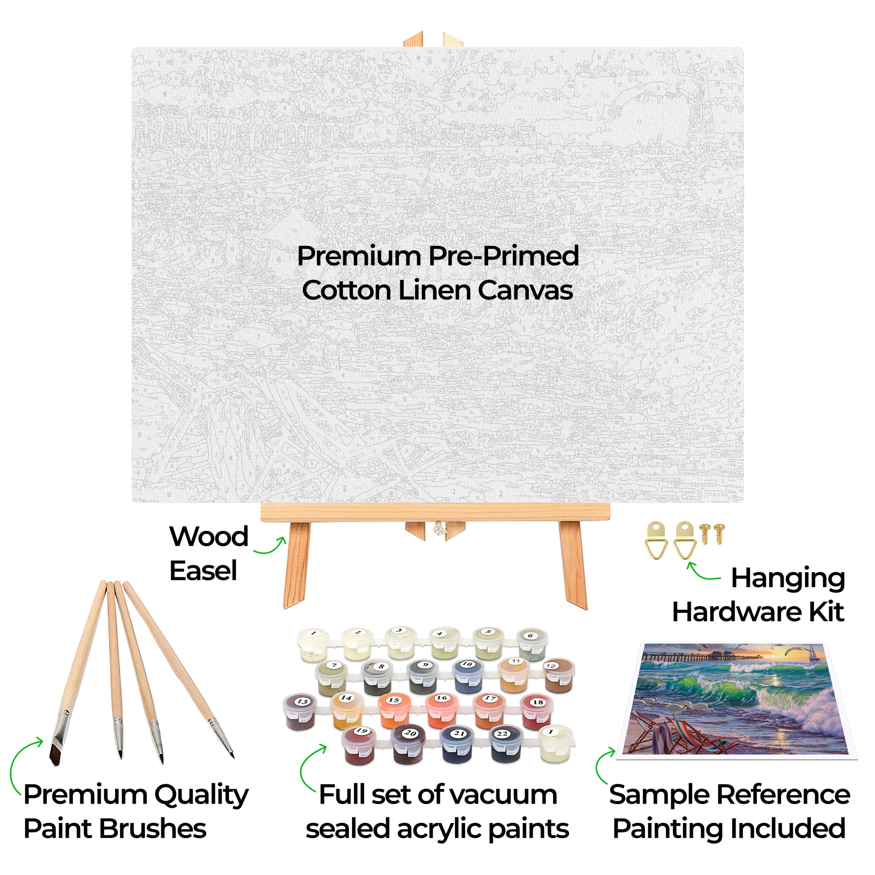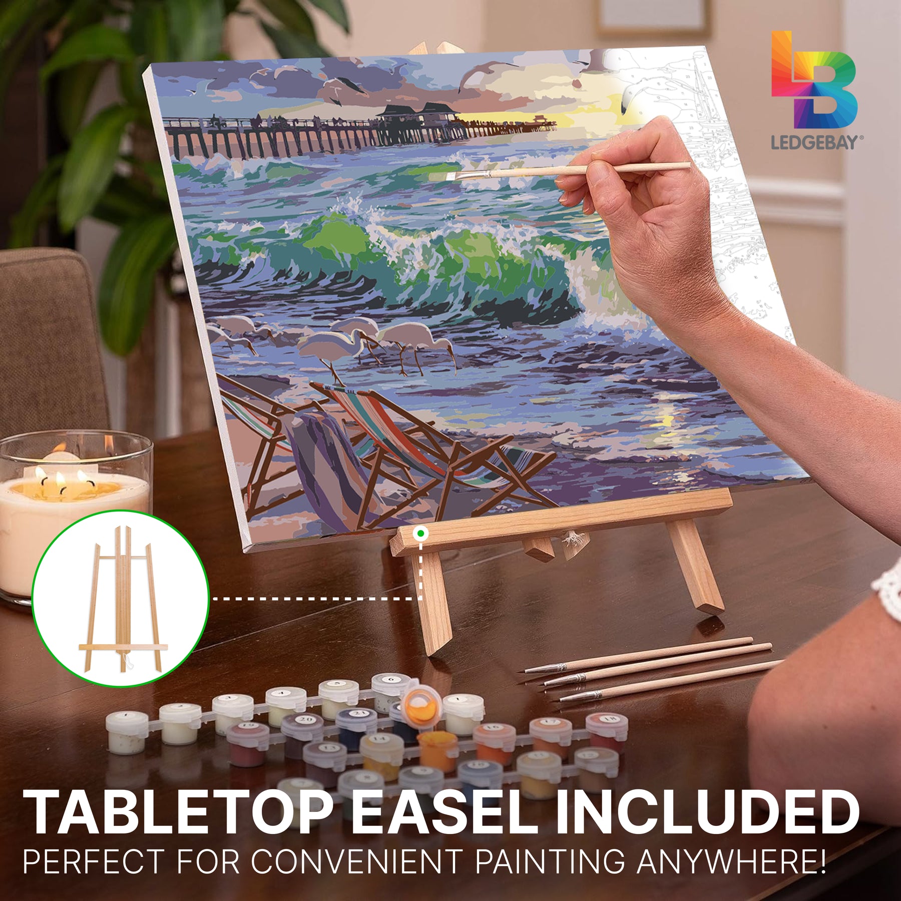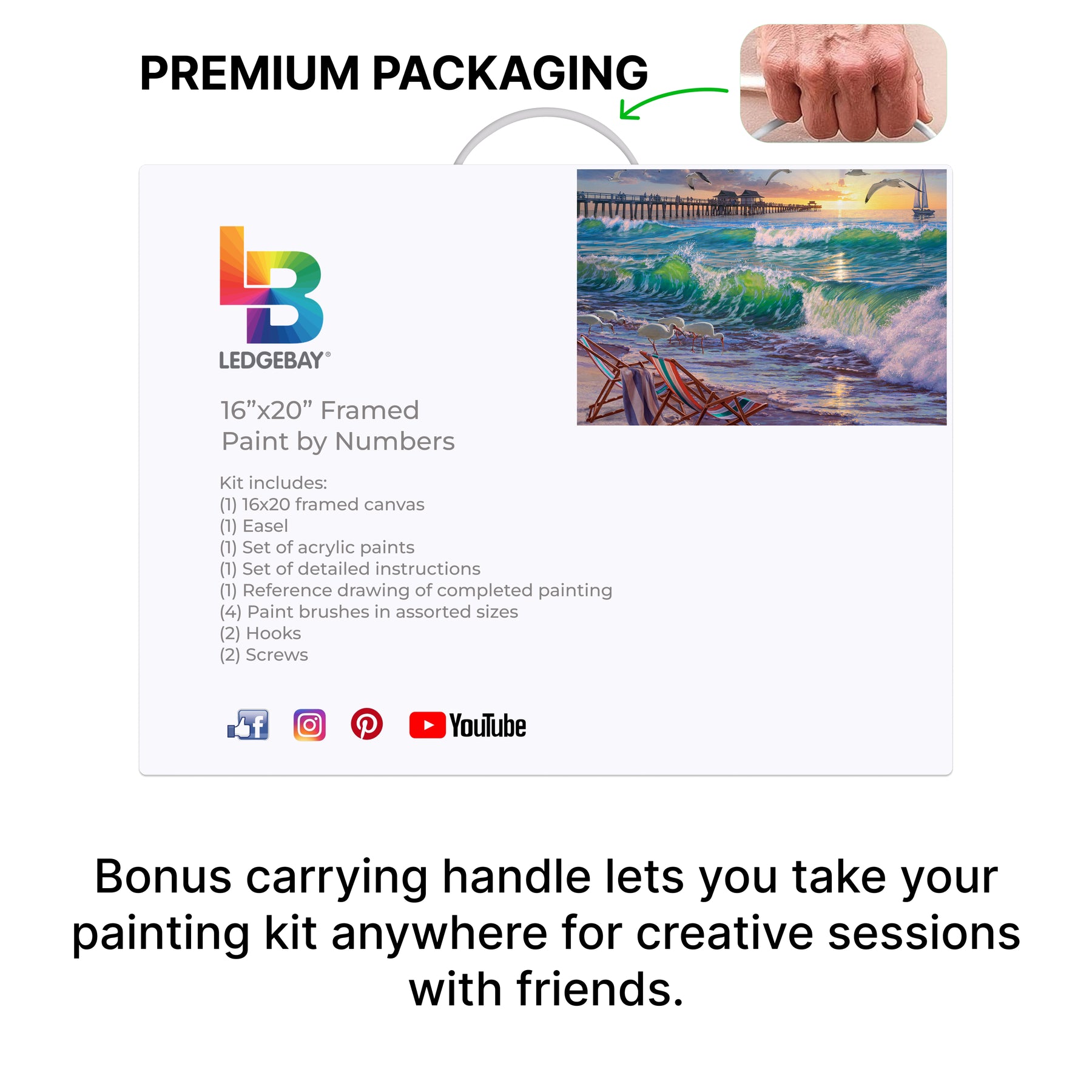 Our Framed kits include:    Ledgebay provides everything you need to become an inspired artist. Our large paint by numbers kit for adults includes one pre-stretched and framed premium pre-primed canvas, set of instructions, 4 paint brushes of different sizes, a tabletop easel, 1 vacuum sealed set of acrylic paints, a small photo of the finished painting for reference, and an 11" x 17" printout in case the artist messes up.