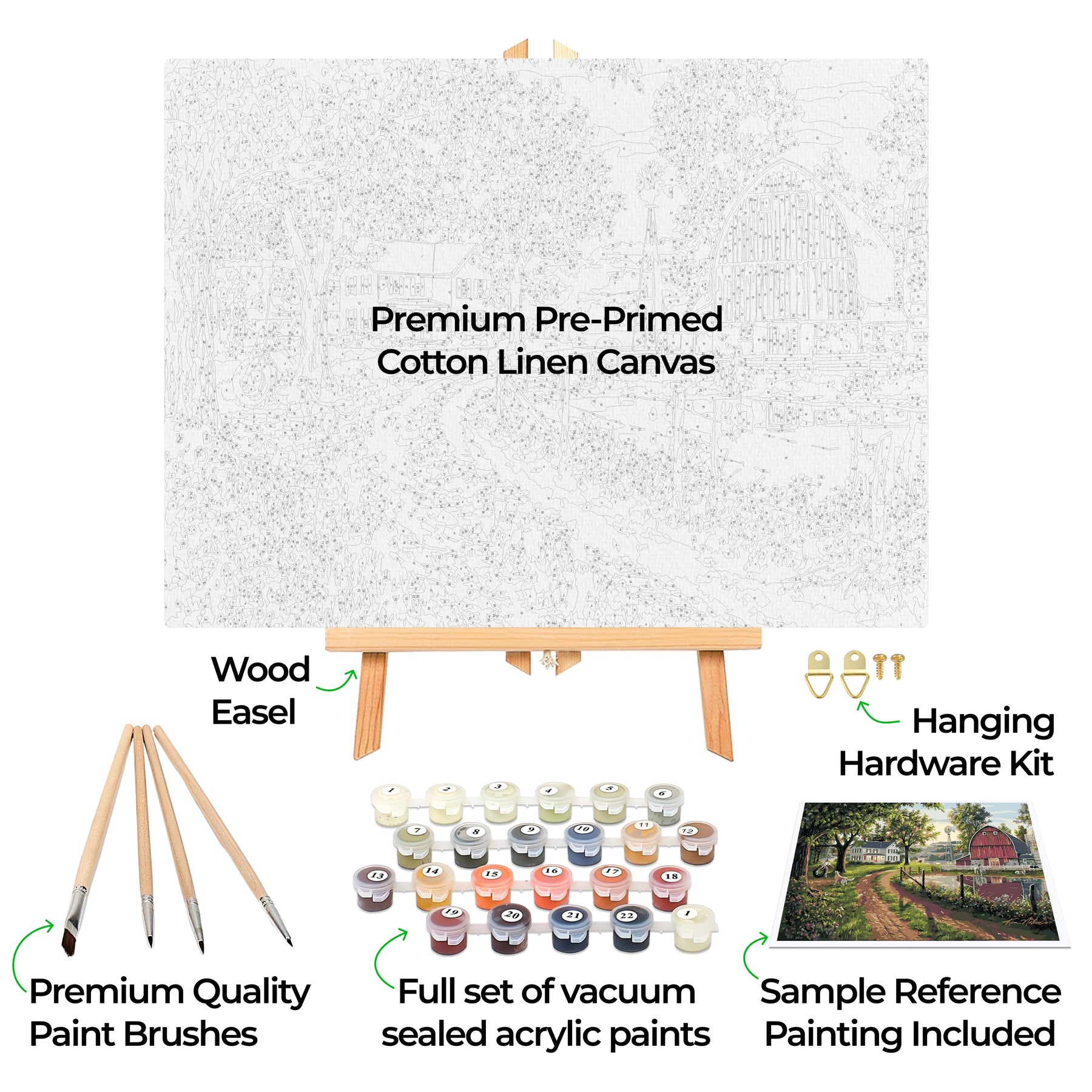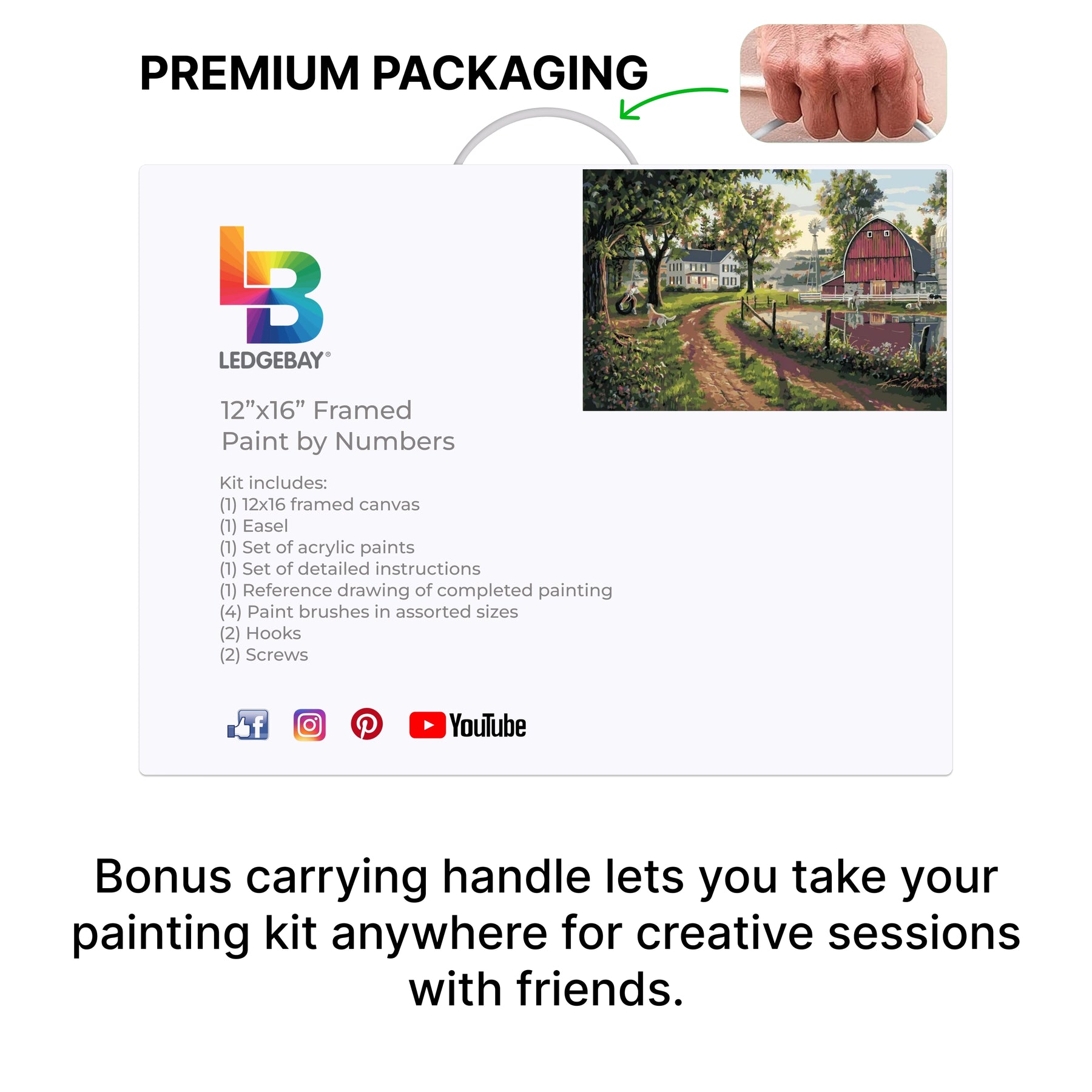 Our Framed kits include:    Ledgebay provides everything you need to become an inspired artist. Our large paint by numbers kit for adults includes one pre-stretched and framed premium pre-primed canvas, set of instructions, 4 paint brushes of different sizes, a tabletop easel, 1 vacuum sealed set of acrylic paints, a small photo of the finished painting for reference, and an 11" x 17" printout in case the artist messes up.