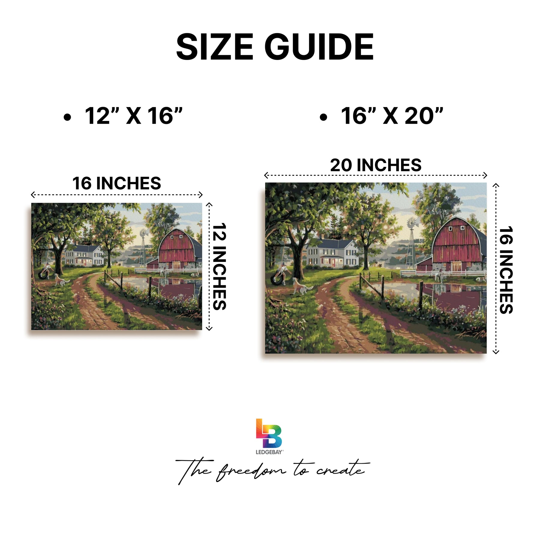 Our Unframed kits include:   Ledgebay provides everything you need to become an inspired artist. Our large paint by numbers kit for adults includes one premium pre-primed canvas, set of instructions, 4 paint brushes of different sizes, 1 vacuum sealed set of acrylic paints, a small photo of the finished painting for reference, and an 11" x 17" printout in case the artist messes up.