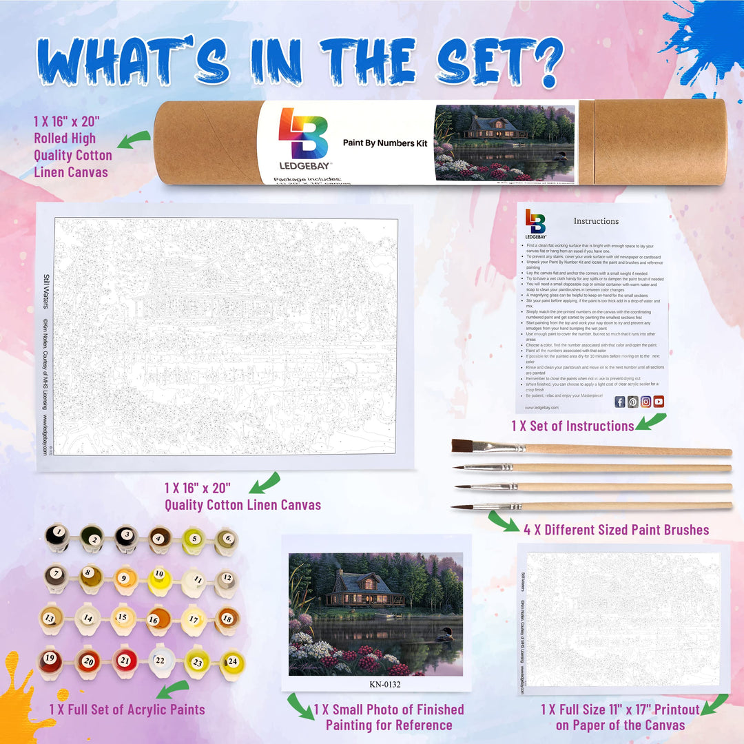 Our Unframed kits include:   Ledgebay provides everything you need to become an inspired artist. Our large paint by numbers kit for adults includes one premium pre-primed canvas, set of instructions, 4 paint brushes of different sizes, 1 vacuum sealed set of acrylic paints, a small photo of the finished painting for reference, and an 11" x 17" printout in case the artist messes up.